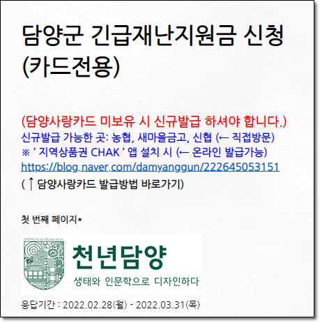 온라인으로 신청을 하시면 담양사랑카드로 충전 지급되며 방문신청을 하게 되면 지역 농협을 통해 ㅣㅈ류상품권을 배부합니다.