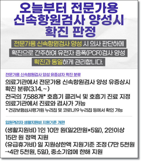 ※ 3월 16일부턴 1인 코로나 확진시 10만원 2인이상 격리시 인원이나 날짜 상관없이 15만원 정액지급