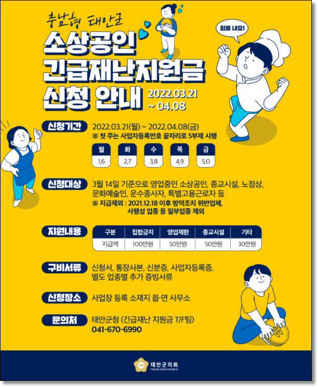 코로나19로 인해서 힘든 시민들과 소상공인 분들을 위해서 태안군에서는 재난지원금을 지급하고 있는데요. 2년동안의 코로나와의 싸우고 있는 소상공인, 종교시설, 노점상 등의 분들에게 긴급재난지원금을 지급하고 있으니 아직 신청을 하지 못한 분들이라면 참고하세요.