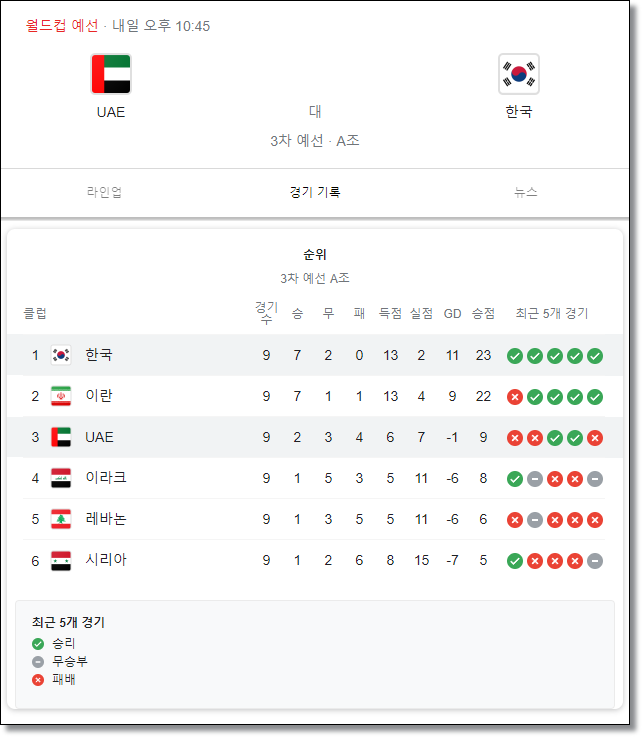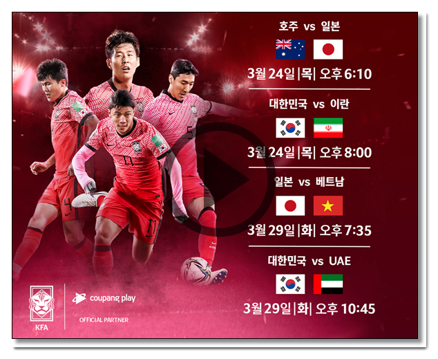 3월 29일에는 한국 UAE 뿐 아니라 조1위를 차지한 일본과 베트남의 경기와 이란과 레바논, 시리아와 이라크 경기가 펼쳐지는데요. 마지막 10차전으로 재미있는 시청을 하시면 좋을 것 같네요.