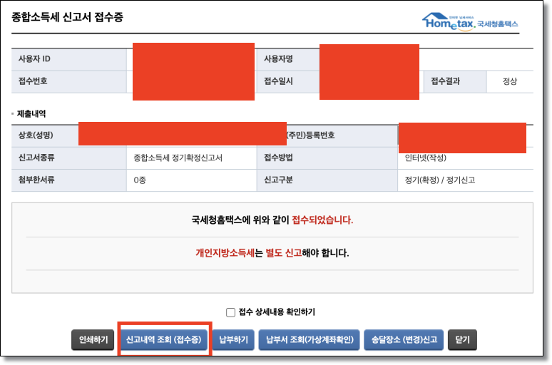 마지막으로 신고내역 조회를 누르시면 지방세 환급을 받으라는 창이 나오게 되는데요. 여기까지 해야 프리랜서 종합소득세 환급이 되니 참고하세요!