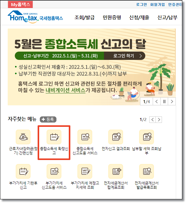일단 종합소득세신고를 하기 위해서는 홈택스에 들어가시거나 모바일을 통하 손택스로 들어아셔서 신청을 하시면 되는데요. 이번에는 PC를 이용한 신고방버에 대해서 설명을 해 드리겠습니다.