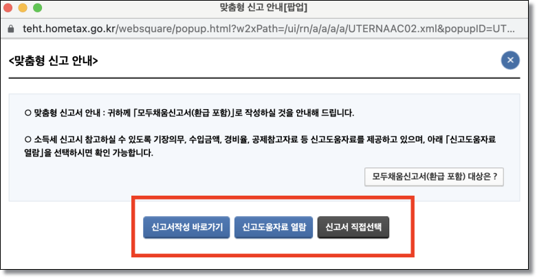 일단 프리랜서 환급 방법을 알아보면 종합소득세를 신고해야 한다는 것입니다. 위와 같은 이미지가 나오게 되면 신고서작성 바로가기를 놀러주세요. 그리고 확인을 누르시면 신고 화면으로 넘어가게됩니다.