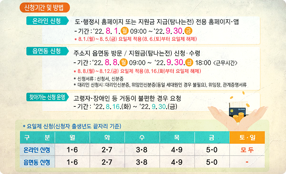 만약, 온라인 신청이 되지 않는 분들은 고객센터 ☎1600-3971로 문의주시거나 8월 17일 이후에 주소지의 읍, 면, 동 주민센터에 방문하셔서 오프라인으로 신청하시면 됩니다.