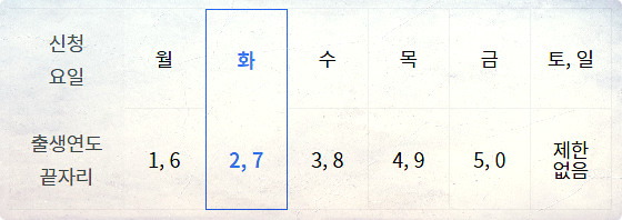 첫주에는 5부제를 실시하고 있으며 오늘 날짜인 8월 2일 화요일에는 출생연도 끝자리 2,7인 분들이 신청이 가능합니다.